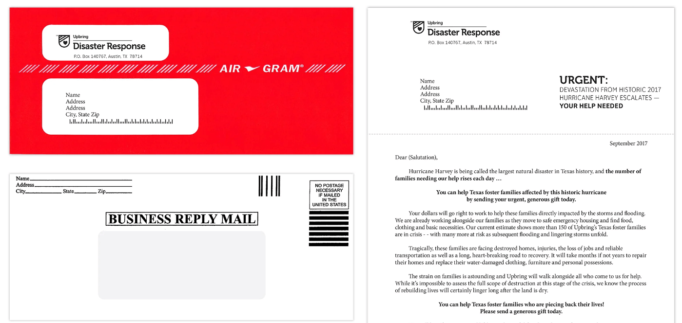At Meyer Partners, we’ve seen firsthand just how effective nonprofit direct mail fundraising can be. For example, we created this emergency appeal for Upbring after Hurricane Harvey that generated incredible results.
