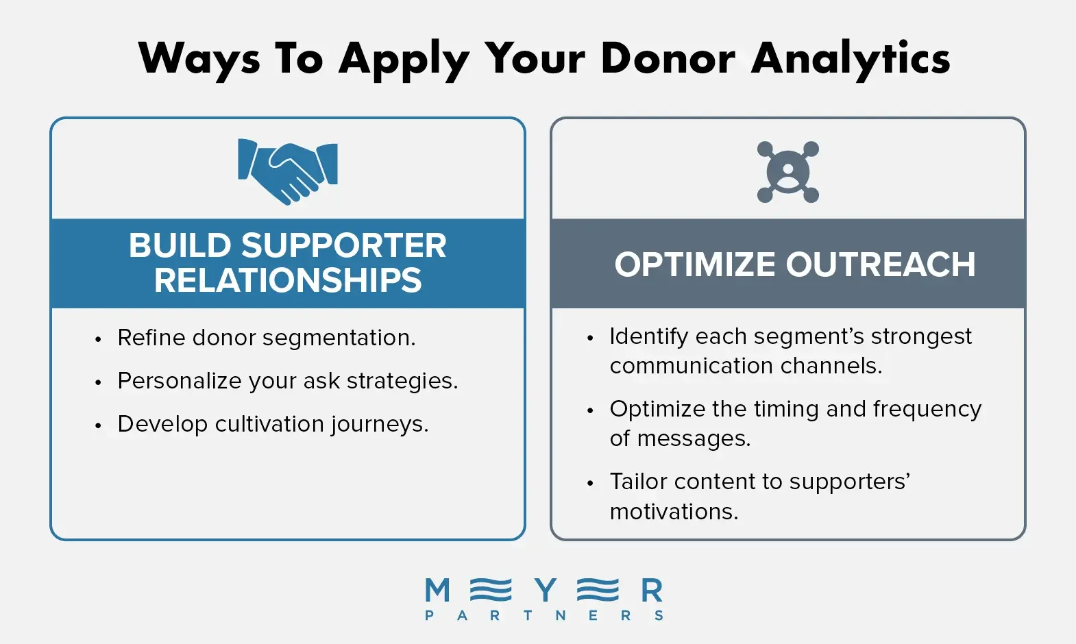 Donor analytics allows your nonprofit to reach the right supporters with the right message at the right time. By applying your insights strategically, you can dramatically improve your nonprofit’s marketing efficiency and response rates. Here’s how to focus your efforts where they matter most: