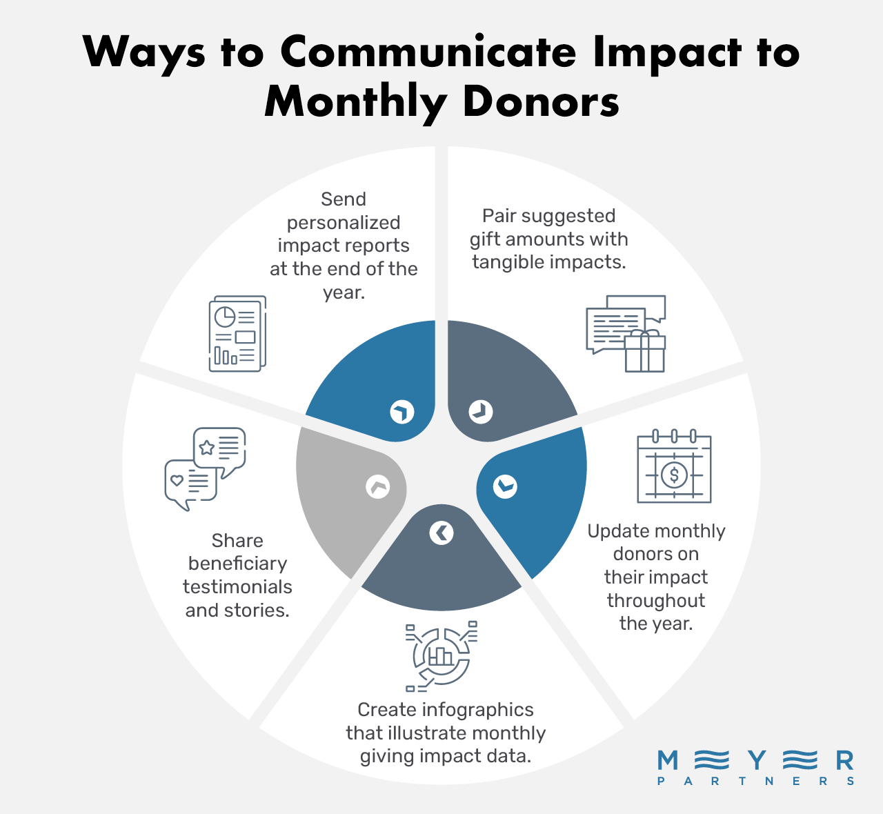 Create infographics that illustrate monthly giving impact data. Visuals communicate information more quickly than words. Design and share a few simple impact graphics that illustrate how much monthly donors give, how many programs they support, etc.