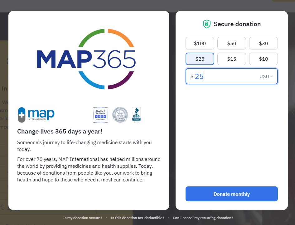MAP International’s monthly giving program is called MAP365, emphasizing how monthly donors make an impact every single day of the year. This nonprofit’s donation page includes a unique monthly giving popup with the program’s name, brief information about the impact of monthly gifts, and a few suggested gift amounts.