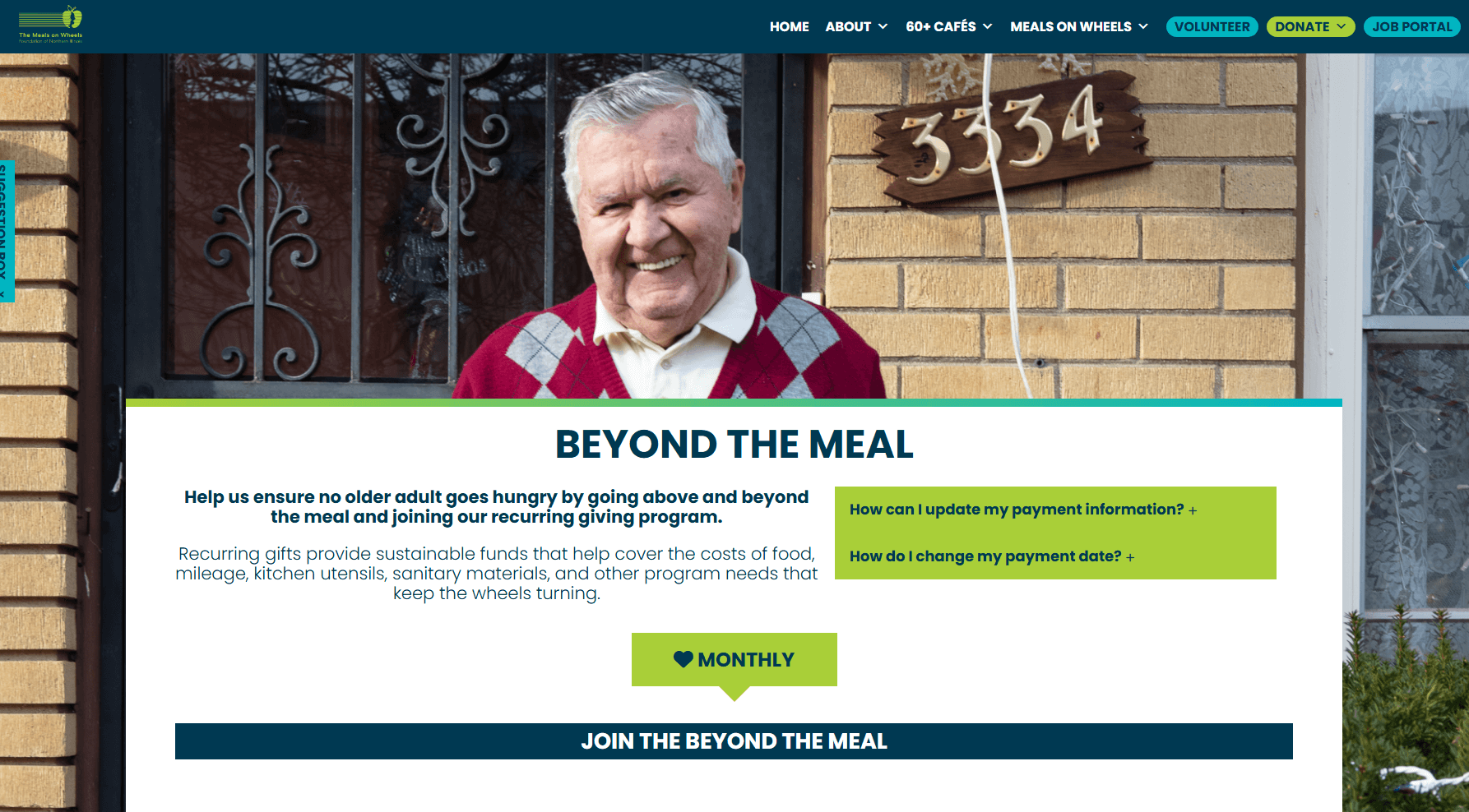 The Northern Illinois chapter of Meals on Wheels has a monthly giving club called “Beyond the Meal.” On the organization’s program page, it explains that “Recurring gifts provide sustainable funds that help cover the costs of food, mileage, kitchen utensils, sanitary materials, and other program needs that keep the wheels turning.”